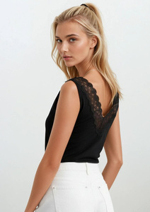 Emili Jess női póló fekete - pamut, széles pántokkal és csipkével