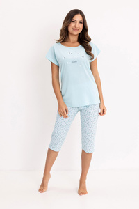 Női pizsama 735 Regina türkizkék - pamut, rövid ujjú, 3/4 nadrág, dekoratív nyomtatással