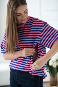 Mamahood Milk&Love rózsaszín és kék csíkos kismama és szoptatós póló - kényelmes és stílusos
