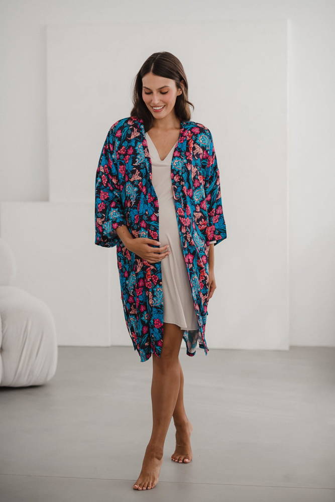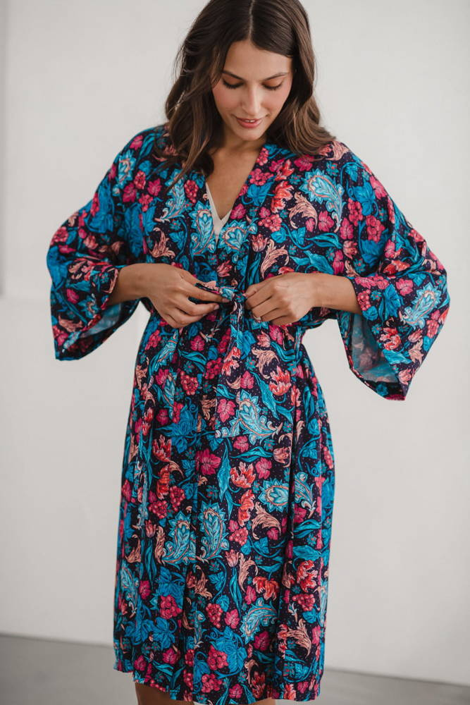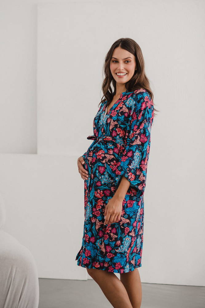 Szlafrok został zaprojektowany z myślą o mamach, dlatego jest nieco dłuższy, abyś spokojnie okryła nim ciążowy brzuszek. Po porodzie bez skrępowania b będziesz mogła spacerować po szpitalnym korytarzu lub na leżąco nakarmiła maluszka w połogu. Posiada kieszenie na niezbędne drobiazgi i pasek do regulowania szerokości.