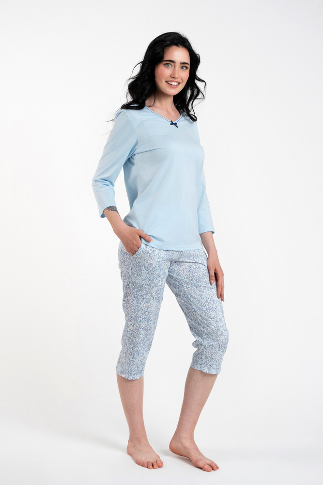 A stílusos női ¾ pizsama ideális a melegebb nyári vagy tavaszi estékre. Az egyenes szabás biztosítja a kényelmet és a mozgásszabadságot, míg a könnyű, lélegző anyag kényelmet és élvezetet nyújt a bőrnek. A női pamut pizsama egy egyszerű, kerek nyakkivágással és aranyos masnival ellátott felsővel, valamint egy zsebekkel ellátott nadrággal rendelkezik, amelyet szép virágmintával díszítettek. Az ilyen nőies pizsamák minden estét kellemesebbé tesznek. Női pizsama ¾ nadrággal és ¾ pulóverrel S-től XXL méretben, kék színben kapható.