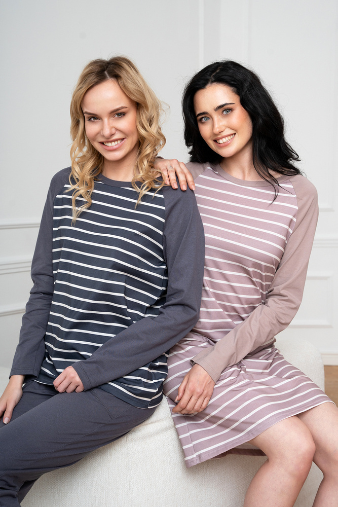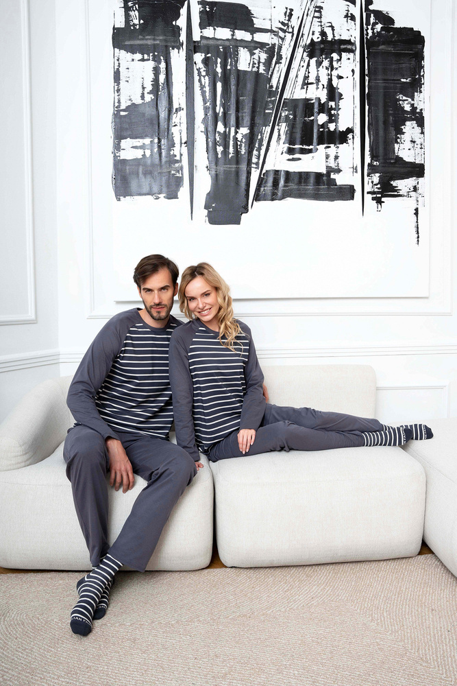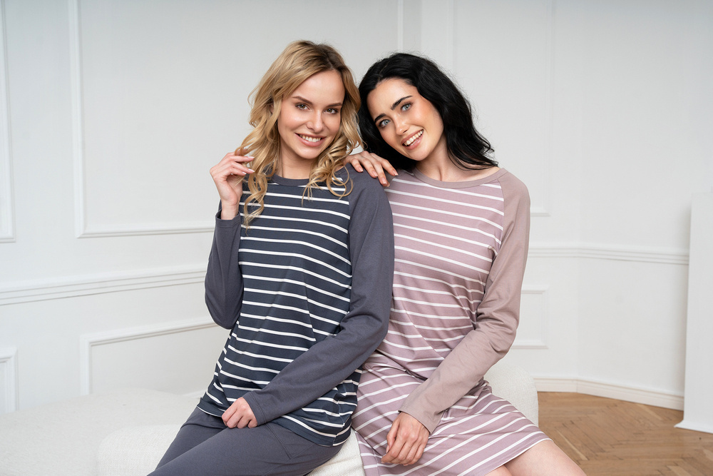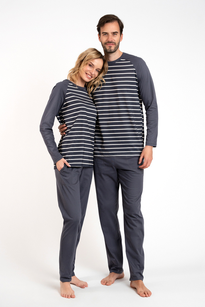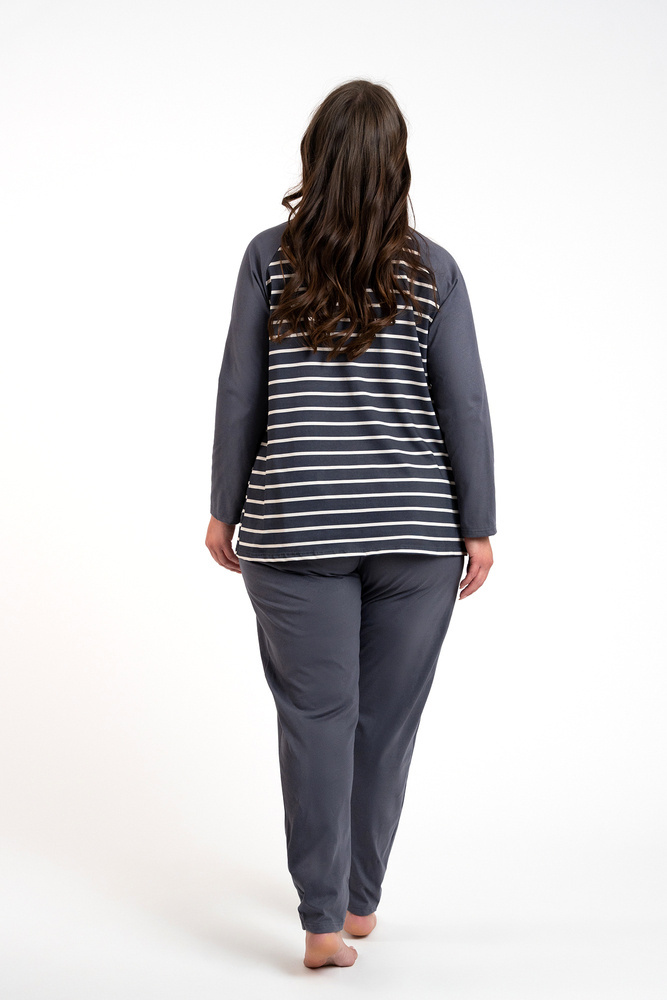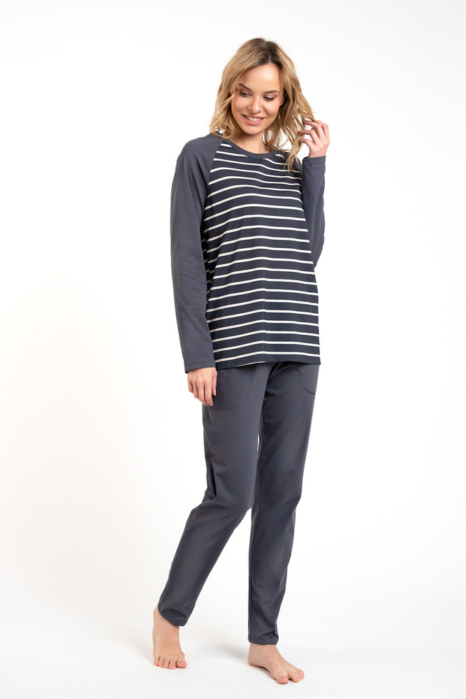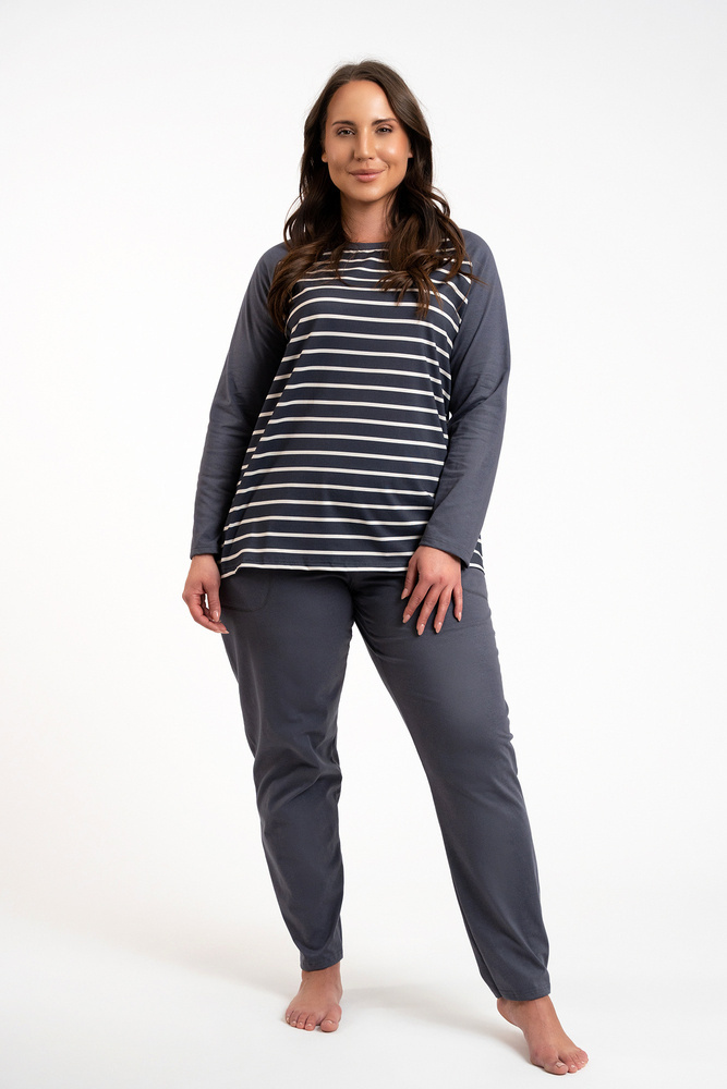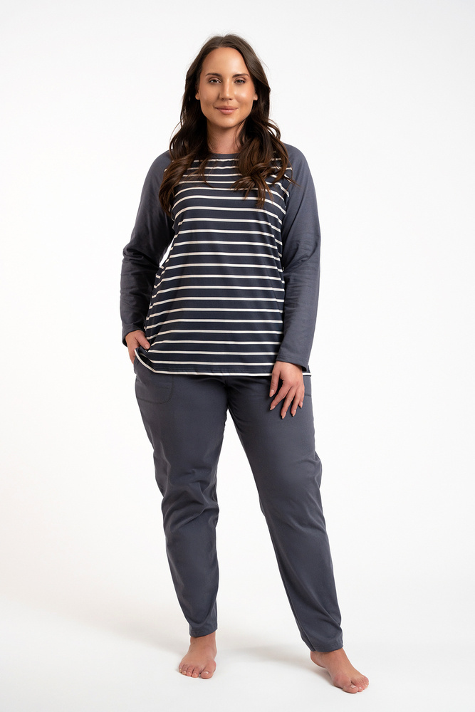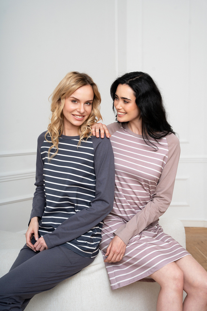A női hosszúnadrágos, hosszú ujjú pizsama klasszikus, amely jól használható mind az otthoni hűvösebb éjszakákon, mind a kirándulásokon. Elegáns, nőies pizsama laza szabással biztosítja a kényelmes éjszakai alvást, míg a biztonságos és lélegző anyag - 100% pamut - gondoskodik a bőr öröméről. Időtlen csíkos mintázat minden korosztályú hölgynek megfelel. Könnyű női pizsama nem eltávolítható gumival, egyszerű stílusban, minden nő szekrényében kell lennie. A női pamut pizsama két színben - grafit és bézs - és S-től XXL méretben kapható.