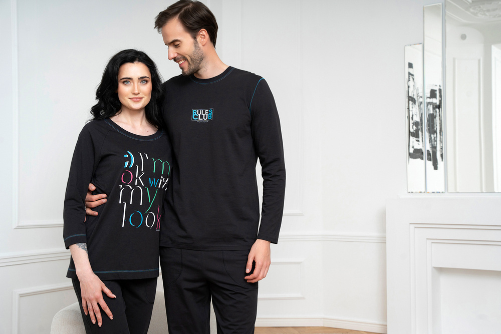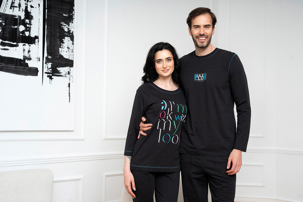 A női pizsama ¾ nadrággal és ¾ blúzzal nagyszerű a melegebb éjszakákra. A természetes anyag légáteresztő és kellemes lesz a bőr számára, míg az egyenes szabás biztosítja a kényelmet és a mozgásszabadságot. A női pamut pizsama pulóverét kerek nyakkivágással zárják, és középen egy dekoratív grafikával - egy érdekes felirattal - van ellátva, amely nagyon tartós szitanyomásos eljárással készült. A pizsamanadrág viszont funkcionális zsebekkel rendelkezik. A divatos női pizsama S-től XXL méretben kapható, fekete színben, színes felirattal.