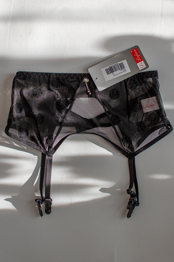 Rendkívül szexi harisnyatartó öv. Kiváló minőségű modell ékszerelemmel a közepén. Oldal és hátoldal puha és tapintható finom hálóból készült. Dupla kampókkal rögzítve.
