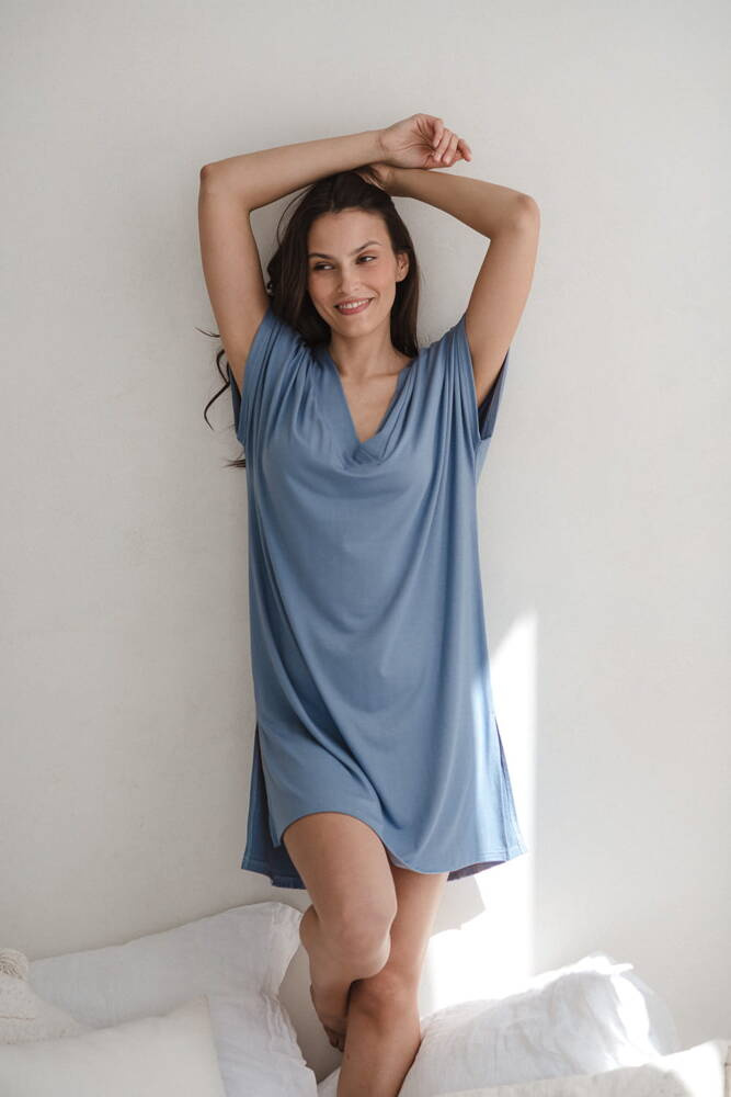 Koszula uszyta z wysokogatunkowej wiskozy bambusowej z dodatkiem elastanu, dzięki czemu nie "wyciąga się" i po praniu wraca do pierwotnego kształtu. Niezwykle elastyczna, dlatego świetnie sprawdzi się jako sukienka porodowa.