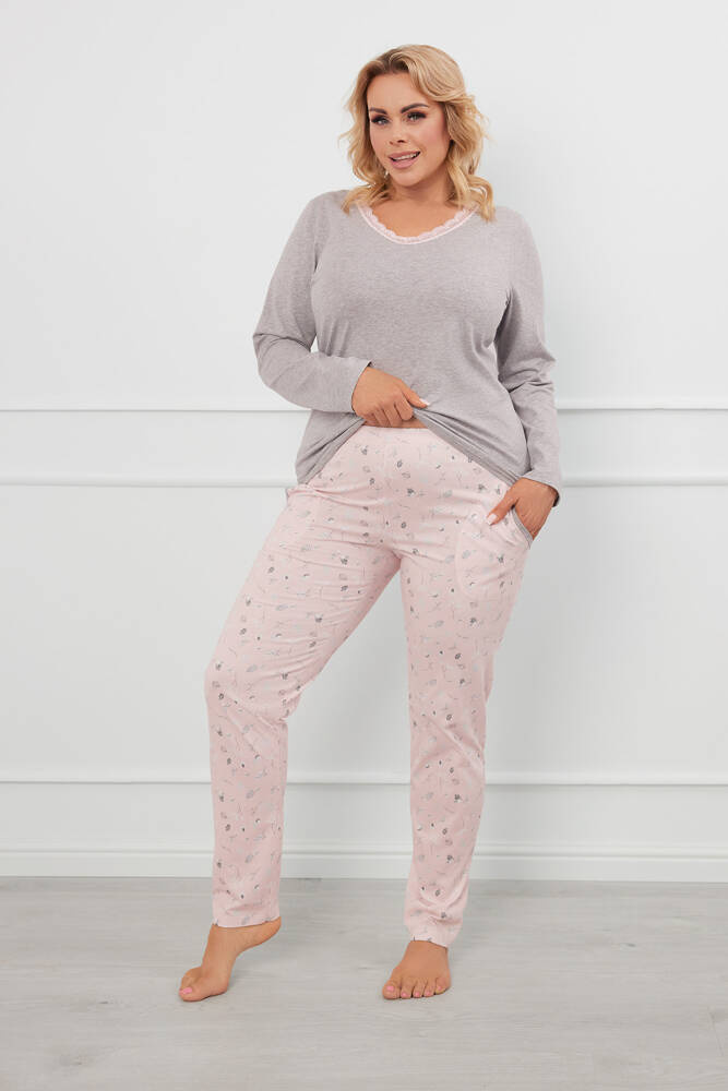 A nadrág makk mintával díszített nadrággal és a szív alakú nyakkivágással és bájos csipkével ellátott blúzzal ez a női hosszú nadrágos, hosszú ujjú pizsama nagyon érdekesnek tűnik. Kétségtelenül kényelmes - egyszerű, klasszikus szabása és természetes, bőrbarát és lélegző anyaga van. A pamut női pizsama biztosítja a mozgásszabadságot és a kényelmet alvás közben, és a finom, de szép minta minden nő ízlésének megfelel. A nadrág funkcionális zsebekkel is rendelkezik. A női pizsama S-től XXL méretben kapható, rózsaszín és melange szürke árnyalatokban.