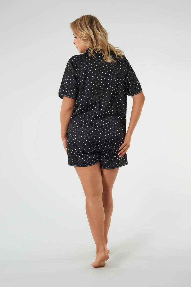 Az itt bemutatott szatén női pizsama a divat kifinomultságának, kivételes eleganciájának és viselési kényelmének kombinációja. Laza, egyenes szabású. Ez a női kigombolt pizsama, kényelmes rögzítéssel rendelkezik. Az alsó rész egyenes nadrágból áll. Az egészet egy divatos szívminta díszíti, amely kissé retro esztétikára emlékeztet. Ez az elegáns női pizsama nyakkivágással is rendelkezik, amely divatos gallérral van ellátva. Van egy praktikus zseb a tetején. Tegye hozzá azt a tényt, hogy női szatén pizsamáink is egyedülálló luxusérzetet nyújtanak Önnek.