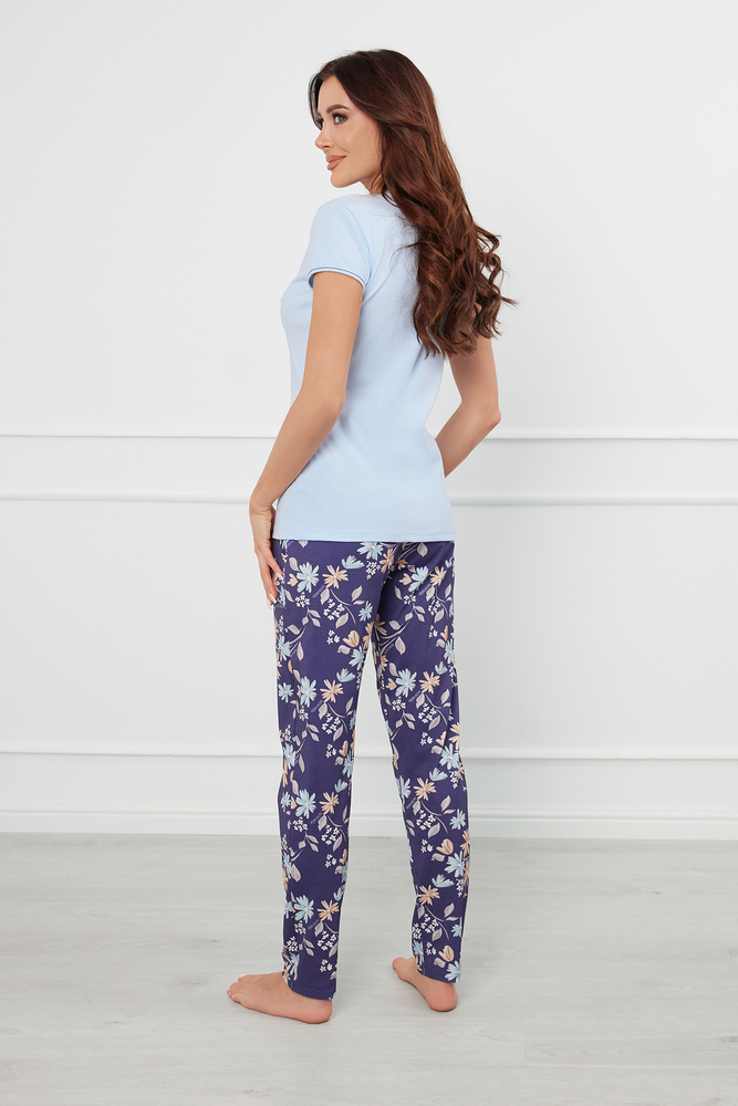 Páratlan kényelem és elegancia egyben. A női pamut pizsama egyenes, enyhén szabott szabású. A póló kerek nyakkivágással rendelkezik, amelyet kifejező csíkozással szegélyeznek. A mellkason egy kis zseb egy díszes masnival. A készletet egy hosszú, zsebes, virágmintás nadrág egészíti ki.