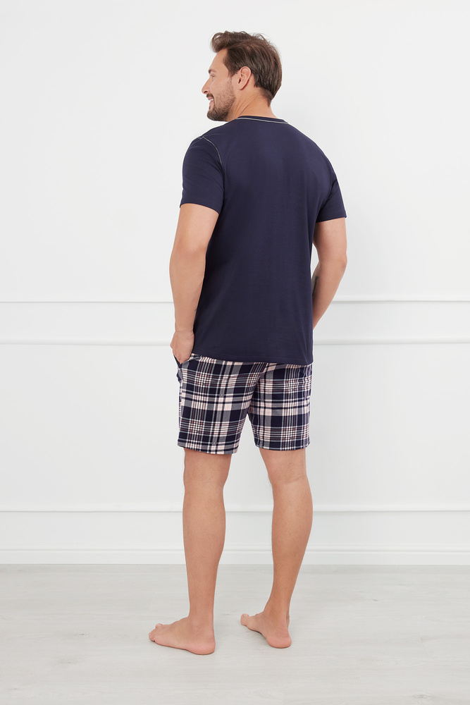 Férfi pizsama egyszerű, időtlen szabásban. A modell kerek nyakkivágással, rövid ujjakkal és rövid lábakkal rendelkezik. A felső rész egyszínű, míg az alsó rész mintás, kockás mintával variálva. A kontrasztos varrás növeli az előkelőséget és a stílust. Az oldalakon két bedobható zseb található. A rövid férfi pizsama előnye a pamut anyag - tartós, puha és jó szellőzést biztosít.