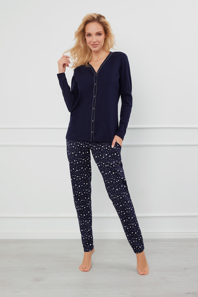 Kigombolt női pizsama pamut bordáskötésből, időtlen dizájn jellemzi. Klasszikus szabású, hosszú ujjú, V-nyakkivágással, amelyet kontrasztos színű finom cérnával szegélyeztek. Hosszú nadrág divatos csillagmintával vonzza a tekintetet. Praktikus, betétes zsebek az oldalakon. Adja hozzá azt a tényt, hogy ez egy női kigombolt pizsama, és az egyértelműen megjelölt gombsor egy kis klasszis és kecsesség az egész megjelenéshez.
