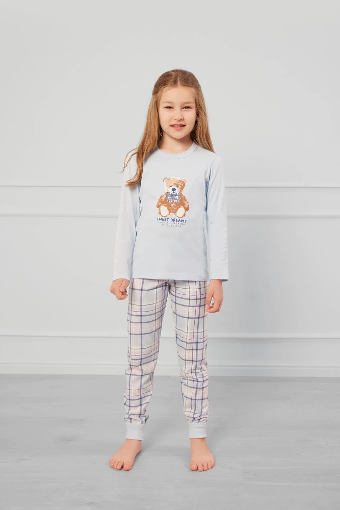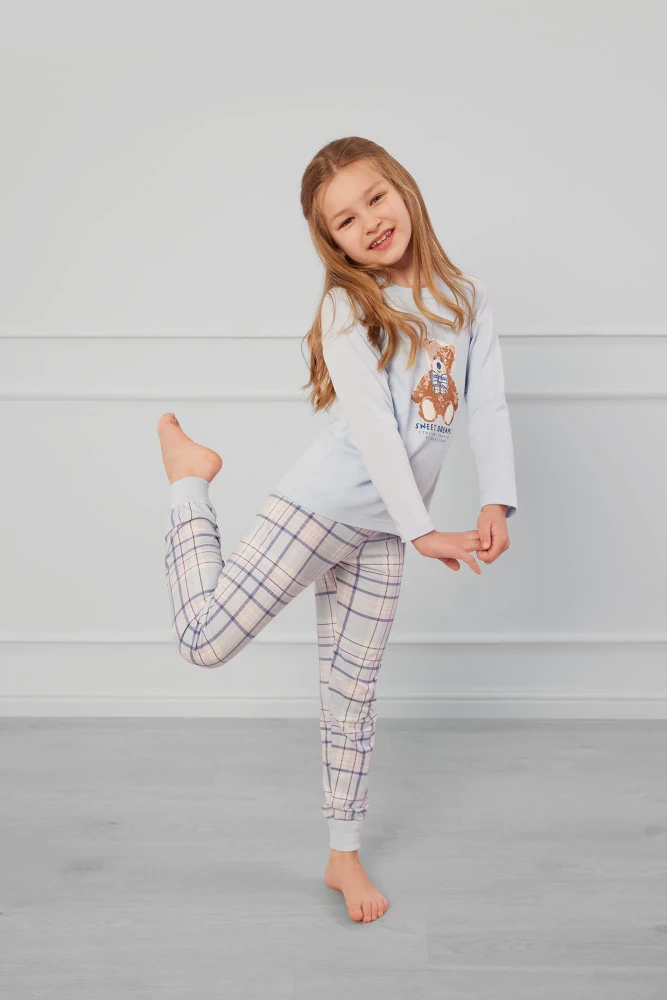 Ez az imádnivaló lány pizsama a kényelem és a mozgásszabadság érdekében lágyan illeszkedő szabásvonalával tűnik ki. A pizsama felső hosszú ujjú és kerek nyakkivágással rendelkezik, és egy imádnivaló mackót és a "Sweet Dreams" feliratot ábrázoló nyomat díszíti Italian Fashion by Guazzone. A nadrág klasszikus szabású és divatos kockás mintával rendelkezik, és a lábak alján praktikus húzózsinórokkal rendelkezik, amelyek megakadályozzák, hogy alvás közben elcsússzon.