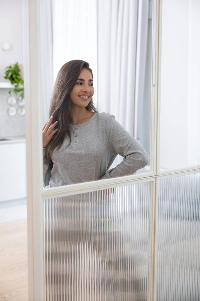 Kiváló minőségű pamutból készült női pizsama. Hosszú ujjú póló, nyakkivágás gombokkal díszítve.