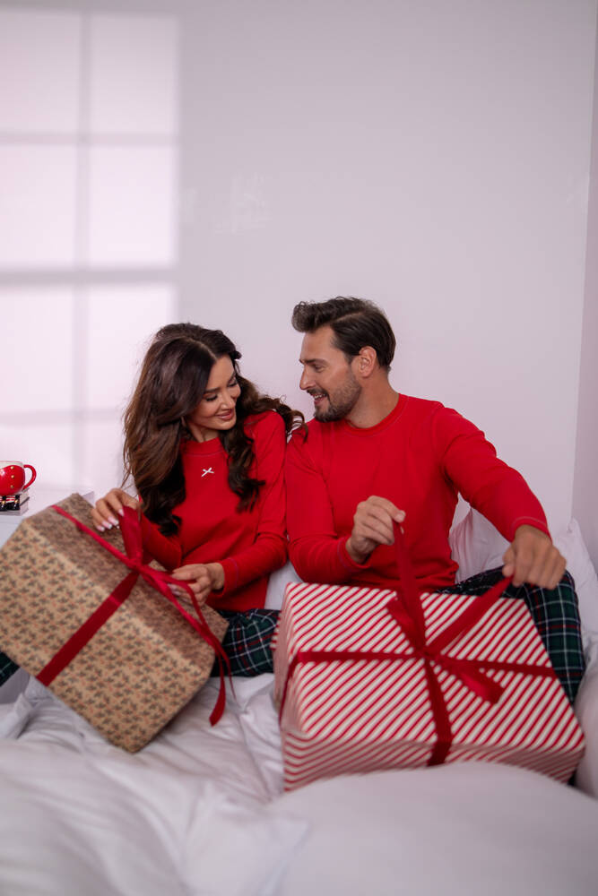 Női karácsonyi pizsama a megoldás a karácsonyi téma szerelmeseinek. Egyszerű, kényelmes szabása van az alvási kényelem érdekében. A felső egyszínű blúz hosszú, raglan ujjakkal, kontrasztos cérnával szegélyezve. Egy kis kerek nyakkivágással és csövekkel van ellátva. Alatta egy díszes masni. A szett alsó része hosszú nadrágból áll, amelyet időtlen kockás nyomtatással egészítettek ki. A készlet puha és kellemes tapintású 100% pamutból készült.