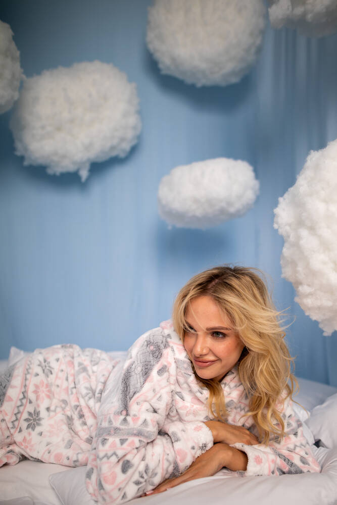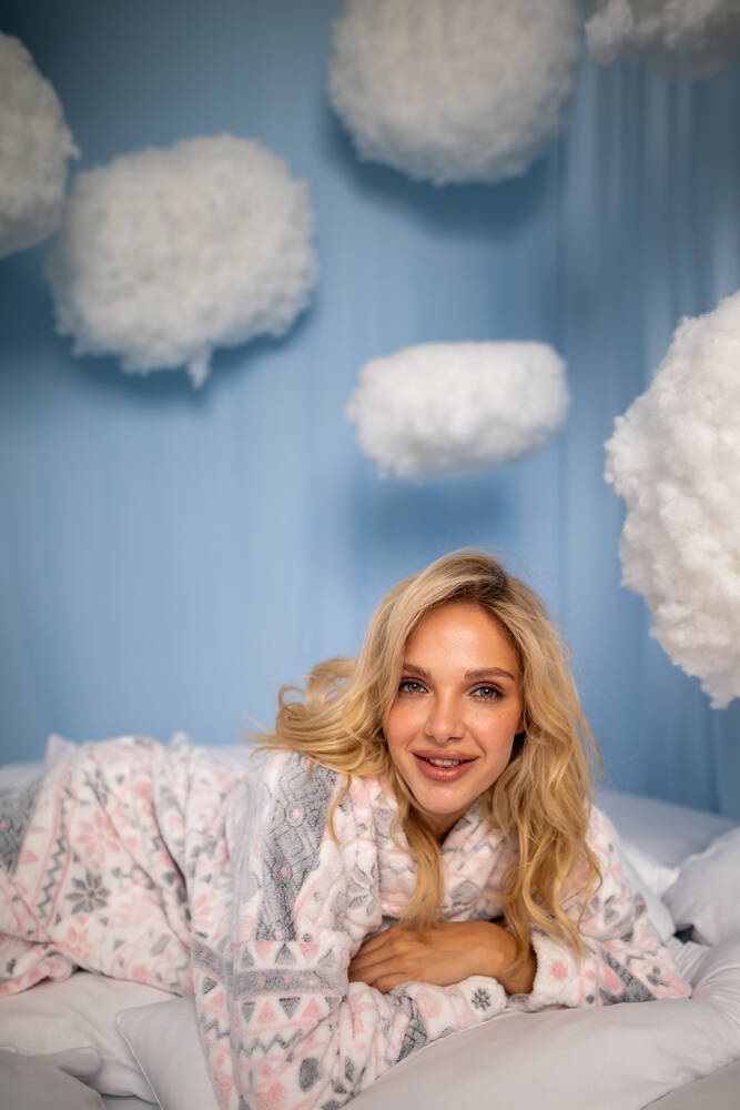 Puha és kényelmes takaró blúz, szép skandináv mintával, rózsaszín és szürke árnyalatokban. Maximális kényelmet és meleget biztosít a kiváló minőségű bi fleece-nek köszönhetően. Laza szabás, amely lehetővé teszi a szabad mozgást, és egy nagy kenguru zseb az elején. A hosszú ujjak és a kapucni extra védelmet nyújtanak a hideg ellen. A női takaróblúz univerzális méretben kapható, hogy a legtöbb alakra illeszkedjen.