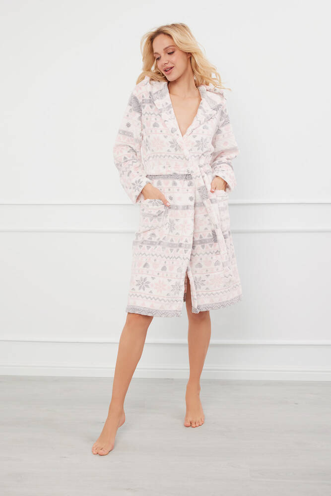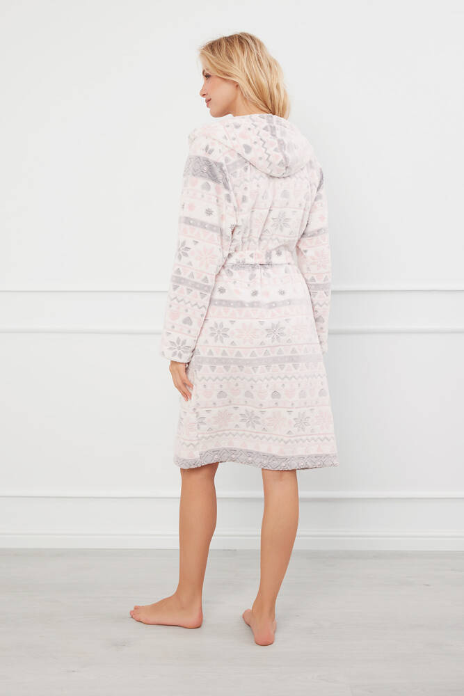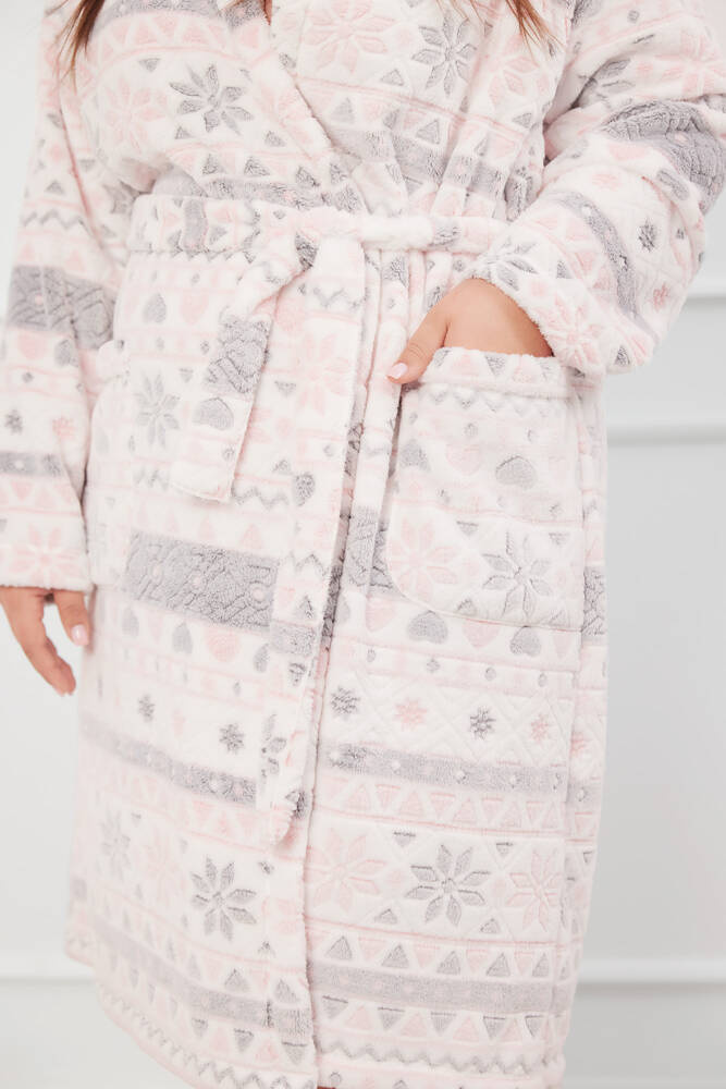 Meleg női köntös puha, bolyhos bi-fleece-ből készült, a kivételes kényelem és melegség érdekében. A klasszikus szabás praktikus kapucnival gazdagított, amely extra védelmet nyújt a hideg ellen. A köntös két praktikus zsebbel és egy derékszíjjal is rendelkezik a tökéletes illeszkedés érdekében. A lágy pasztellszínek és a finom skandináv minták bájos és nőies jelleget kölcsönöznek neki.