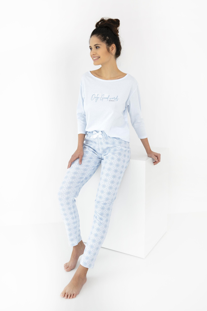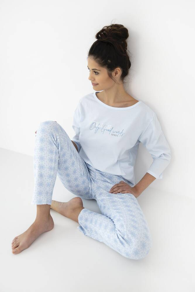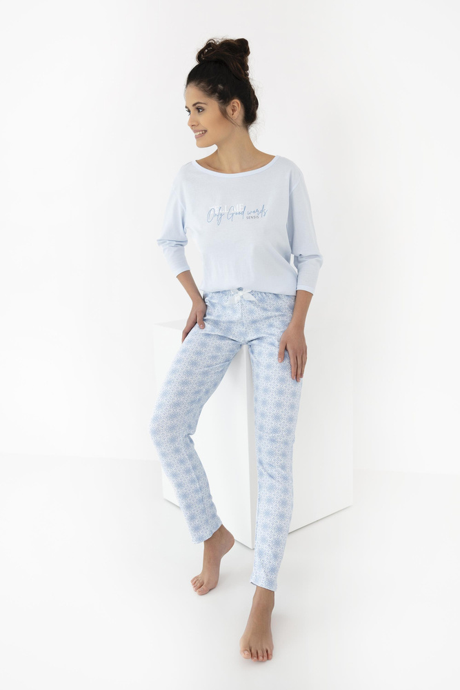 Női pamut pizsama. 3/4 ujjú póló, kerek nyakkivágással. Hosszú nadrággal kiegészítve.