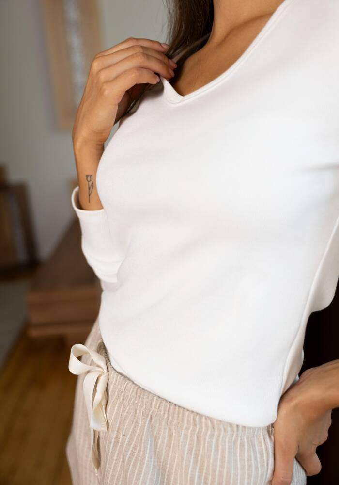 Kiváló minőségű pamutból készült női pizsama. Hosszú ujjú póló, v kivágás.