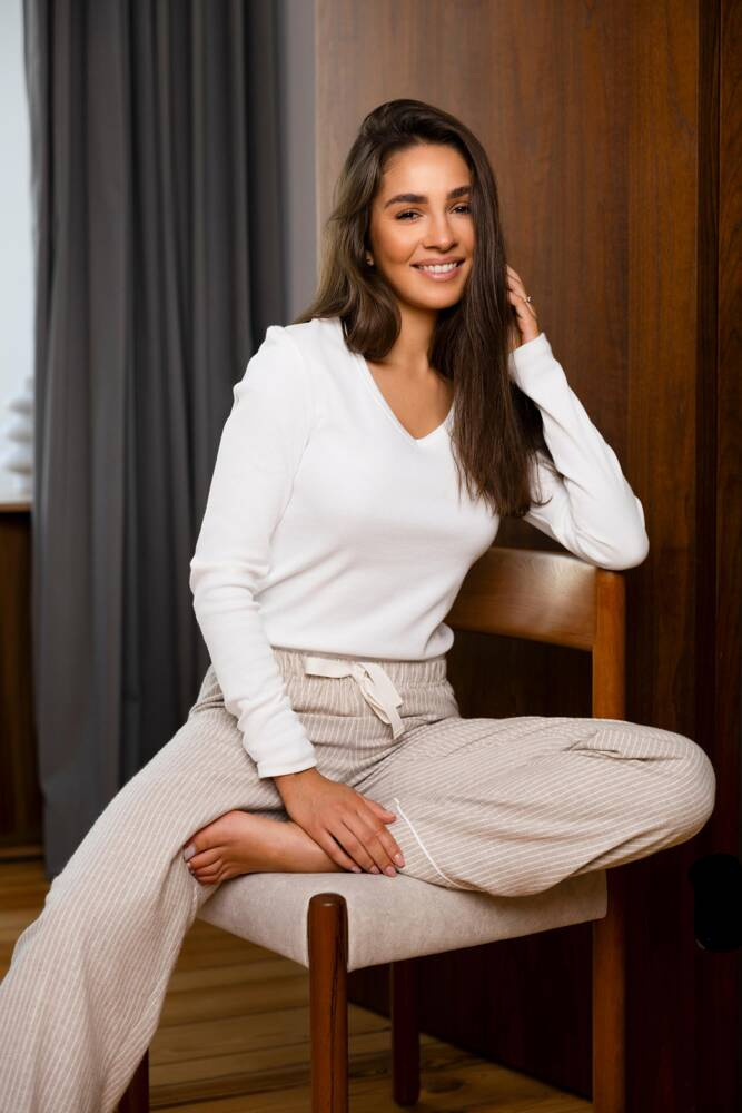 Kiváló minőségű pamutból készült női pizsama. Hosszú ujjú póló, v kivágás.