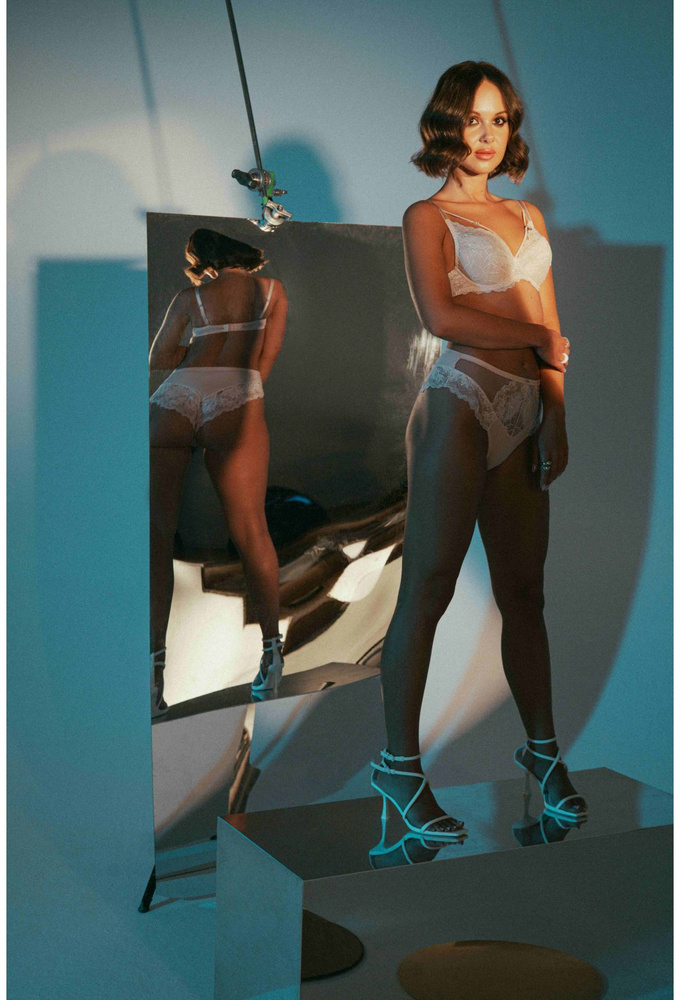 Push up melltartó csillogó brokáttal . Csipkés kelyhek feltűnő csipkével, kivehető szivacsokkal. Állítható, nem levehető vállpántokkal rendelkezik. Stabil anyagból készült áramkör, oldalsó bálnacsont nélkül. Két vagy három horoggal rögzíthető, háromfokozatú állítással. K 1638 szerkezet.