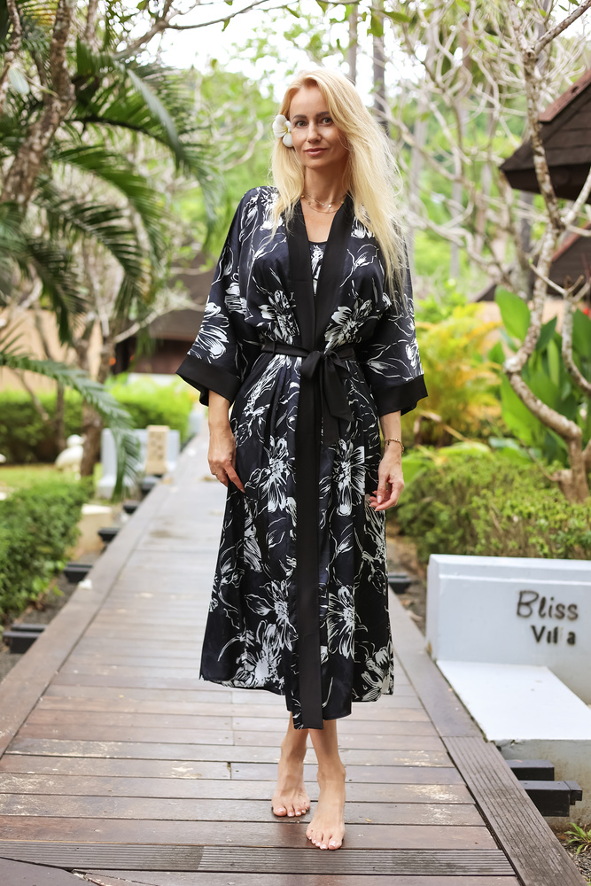 A laza forma szélesebb ujjakkal könnyedséget és eleganciát kölcsönöz. Kiváló minőségű mintás szatén. Az öv lehetővé teszi, hogy a derekát tetszés szerint állítsa be. A házikabátot fürdőruhafelsőként is használhatja.