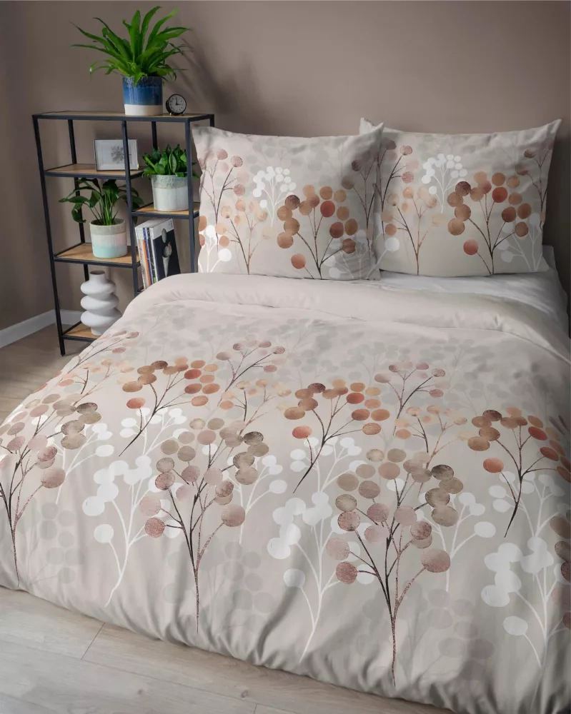 5223 A Pościel satynowa gałązki z okrągłymi liśćmi Detexpol beżowy