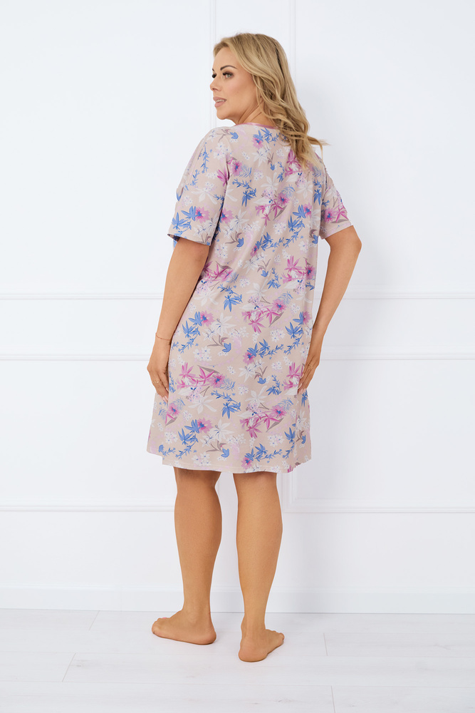 Ez a női rövid ujjú hálóing a stílus, a kecsesség és az elegancia harmóniája. A teljes mozgásszabadságot biztosító kényelmes szabást és a puha, 100% pamutot pasztell árnyalatú virágmintával kombinálja. Az ingnek V-nyakú nyakkivágása van, amelyet fényes szegély erősít.