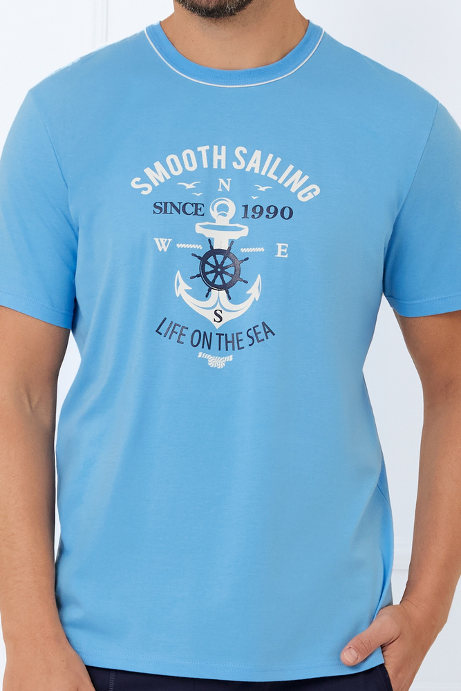 Férfi tengeri stílusú rövid pizsama 100% pamutból. Egyszerű, kényelmes szabása miatt megkülönböztethető. A rövid ujjú, kerek nyakkivágású, szalaggal szegélyezett póló horgonynyomással és stílusos betűkkel van díszítve, hogy hangsúlyozza a karakterét. A készletet egyszínű, zsebes rövidnadrágok egészítik ki.