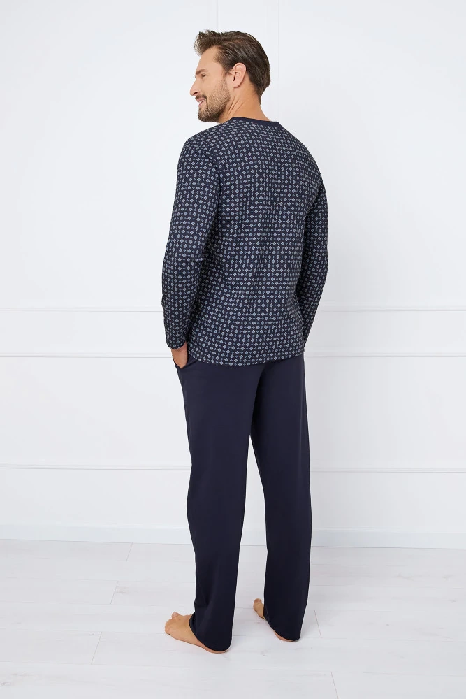 Férfi hosszú ujjú pizsama a divatos és stílusos hálóruhát kereső férfiak számára. Klasszikus szabása kényelmes lesz alvás közben. A felső egy kigombolt blúz, ahol a mintás nyomtatás előtérbe kerül egy feltűnő gombsorral. Két foltos zsebbel rendelkezik. Az alsó hosszú, egyszínű nadrágok. Mindegyik 100% pamutból készült.