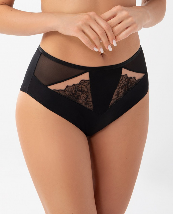 Szinte az egész fenékre kiterjedő nyílt vágás. Dupla hálóból és csipkéből készült A lábak simán befejeződnek, hogy a bugyi ne látszódjon a ruházat alatt.