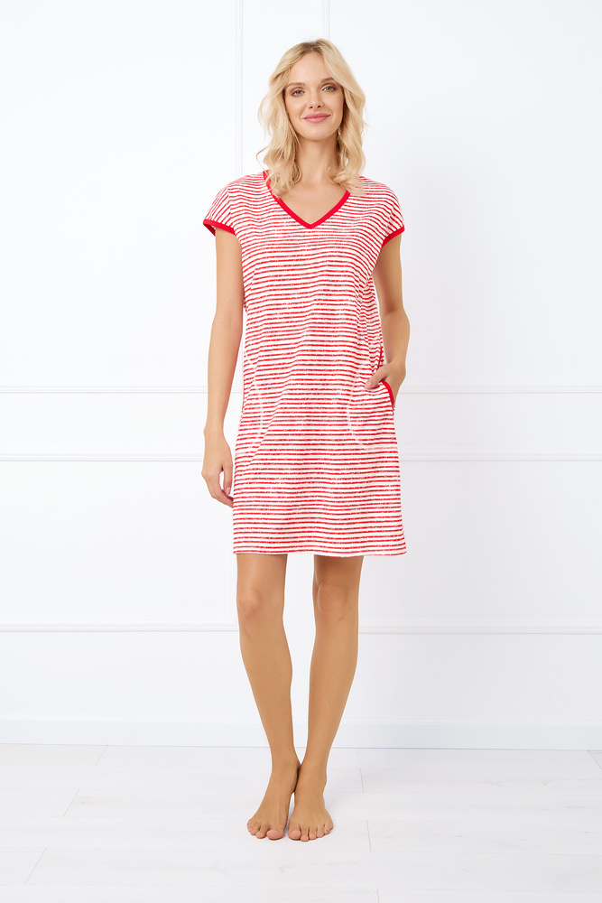 A tengerészeti ihletésű női rövid ujjú hálóing nagyszerű választás a meleg napokon. Egyenes szabás és csíkos mintás mintázat jellemzi. V-nyakú, kontrasztos szalaggal szegélyezett, kontrasztos csíkozással - hasonló részletek találhatók az ujjakon és a zsebeken is. Mindegyik 100% pamutból készült.