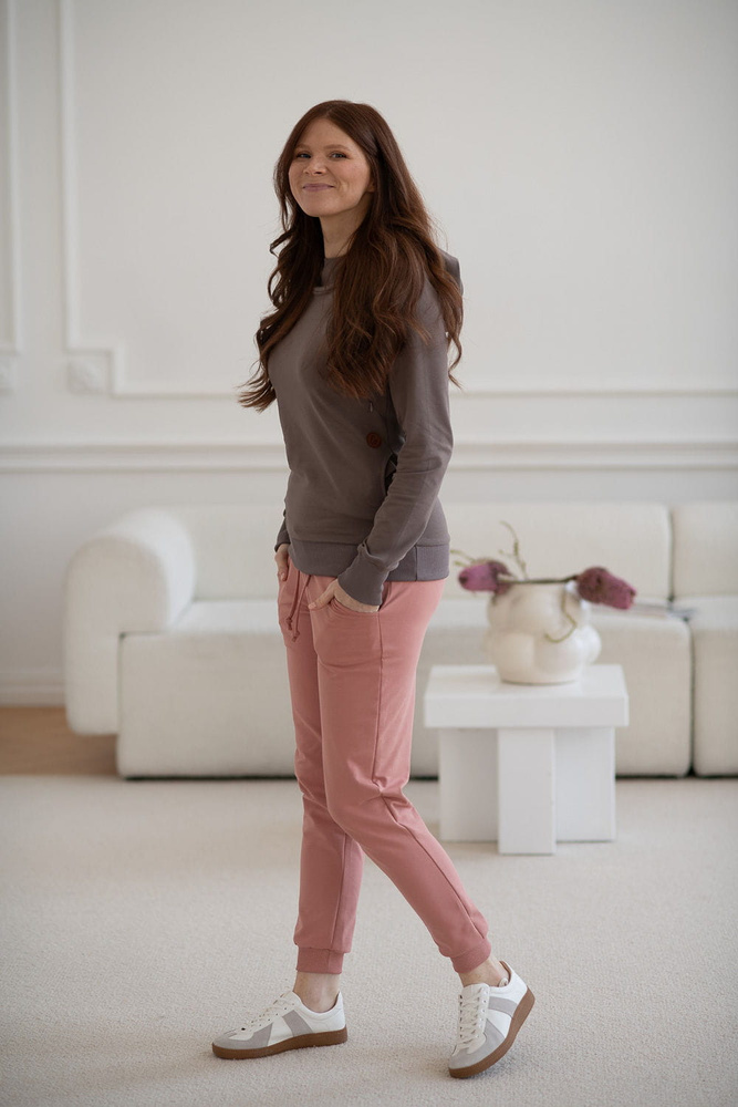 Spodnie z dzianiny w takim kolorze, żeby idealnie pasowały bluz ciążowych i do karmienia Milk Please. Kupując komplet - bluzę i spodnie, masz dresy ciążowe i później dresy do karmienia piersią w jednym!