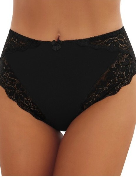 Magas derekú női bugyi. Sima pamutból készült, áttört csipkével kombinálva