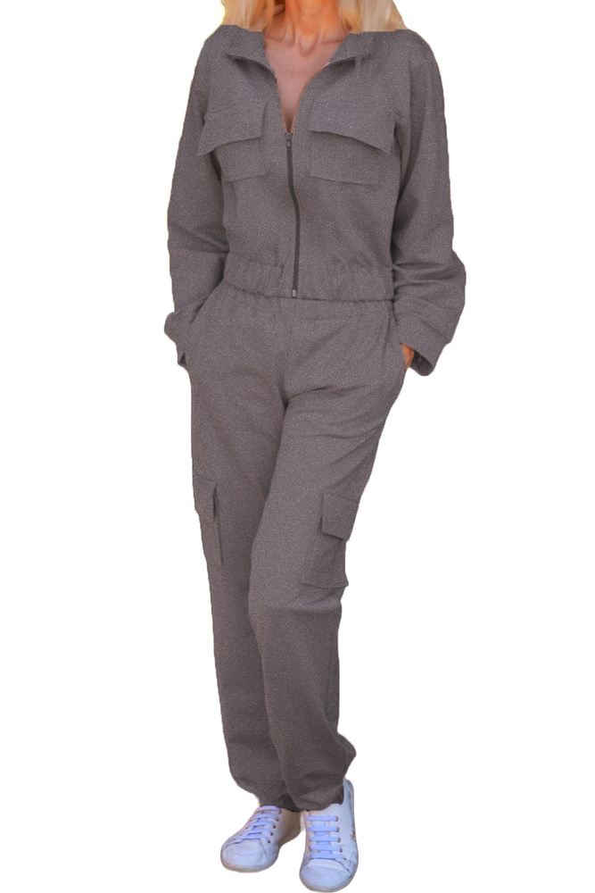 A Mili Mirale női tréningruha egy egyedi szett, amelyet a kényelmet és a stílust értékelő nők számára terveztek. Kiváló minőségű pamut kötött anyagból (95% pamut, 5% elasztán) készült, teljes mozgásszabadságot és tökéletes illeszkedést biztosít az alakhoz. A cipzáras pulóver feltűnő mellzsebekkel és a nagy oldalzsebekkel ellátott cargo nadrág divatos, kissé sportos jelleget kölcsönöz az összképnek. A nadrág elasztikus derékpántja kiemeli a derekat, míg a kényelmes szárak tökéletesen ülnek a lábon.