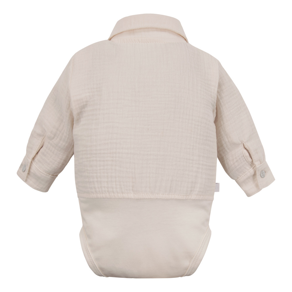 A bodysuit klasszikus ingszerű szabású, gallérral ellátott, amely eleganciát kölcsönöz, miközben megőrzi a funkcionalitást - az ágyéknál és a vállnál lévő nyomógombos rögzítésnek köszönhetően a baba öltöztetése gyors és kényelmes. A muszlin anyag könnyű, légies és barátságos a baba finom bőréhez.