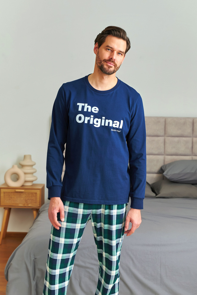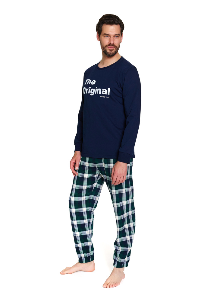 Férfi Doctor Nap 7341 pizsama egy stílusos szett, amely minden évszakban tökéletes. Hosszú ujjú pamutblúz "The Original" nyomtatással és klasszikus kockás nadrág, bordázott szegéllyel befejezve. Ez a modell a családi kollekció része - a partnerének és gyermekének is választhat megfelelő szettet, így egységes, divatos összeállítást hozhat létre az esti vagy közös fotókhoz. A lengyel gyártás biztosítja a minőséget és a kényelmet.