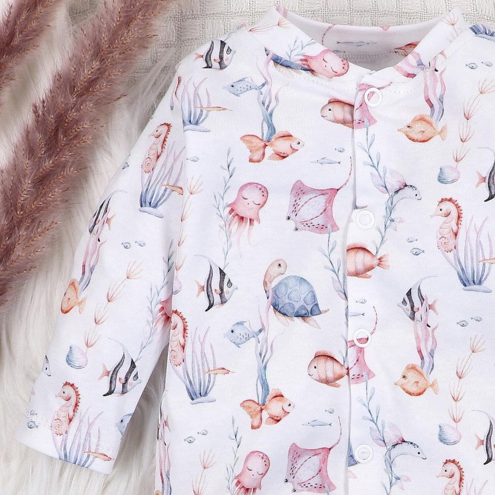• Nini Underwater World pizsama - 100% organikus pamut, beépített lábakkal, teljes hosszában nyomógombokkal.