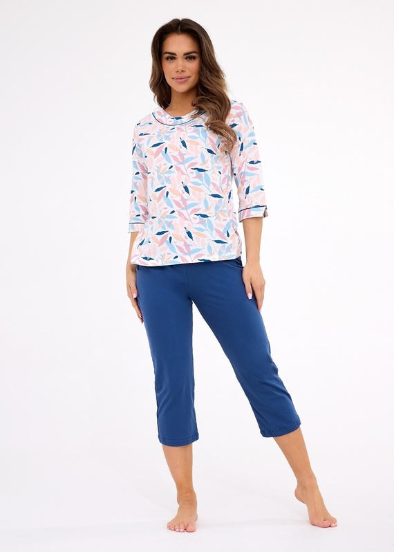 Blúz 3/4 ujjú praktikus megoldás minden évszakban - nem túl meleg, nem túl hideg. A 3/4-es hosszúságú nadrág remekül illeszkedik, és a rugalmas derékpánt szabad mozgást és kényelmet biztosít. A finom minta és a gondos szegélyek bájt és könnyedséget kölcsönöznek a pizsamának.