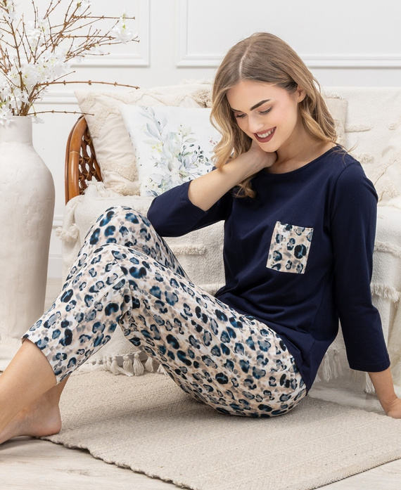 Blúz hosszú ujjú és a klasszikus, teljes hosszúságú nadrágok olyan egységes szettet alkotnak, amely nem korlátozza a mozgást, és lehetővé teszi a teljes kikapcsolódást. Mély tengerészkék elegáns és időtlen jelleget kölcsönöz a pizsamának.