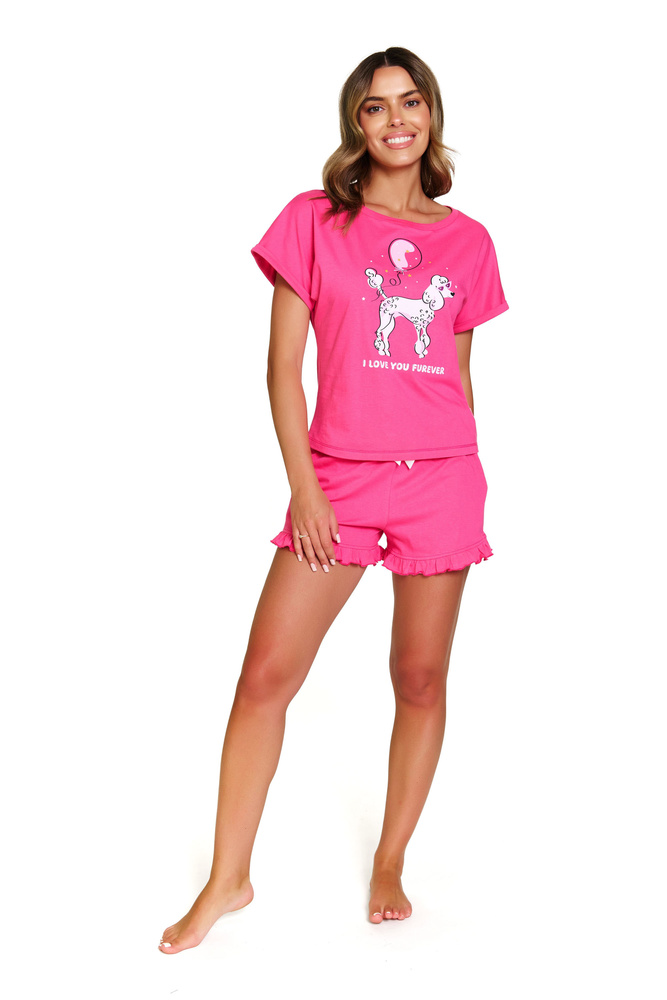 A Doctor Nap 7357 női pizsama, amely a kényelmet a lányos bájjal ötvözi. Kiváló minőségű, puha pamutból készült, tökéletes a nyári estékre és reggelekre. A rövid ujjú pólót imádnivaló uszkárnyomás és a "I love you furever" felirat díszíti. Rövid rövidnadrág fodrokkal és szatén masnival könnyedséget és bájt kölcsönöz. Ez a tökéletes pizsama azoknak a nőknek, akik szeretnek játszani a divattal - akár otthon is.