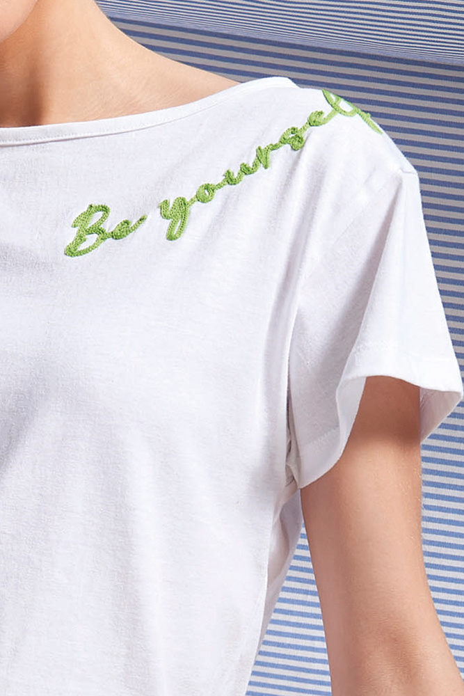 A rövid ujjú póló klasszikus kerek nyakkivágással és dekoratív hímzéssel rendelkezik, amely finom bájt kölcsönöz. A kockás rövidnadrág kontrasztos csíkozással, elasztikus derékpánttal és húzózsinórral rendelkezik, hogy a szegélyt az alakjához igazítsa.