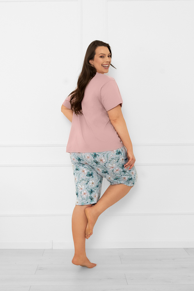 • Női nyári pizsama pamutból. Sima, rövid ujjú póló és nadrág virágmintás mintával. Könnyű, szellős, ideális a meleg éjszakákhoz.