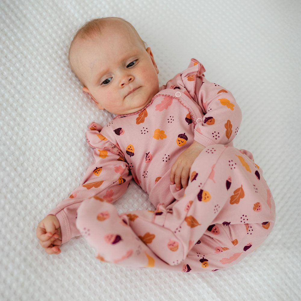 • Rózsaszín baba félalvó a Fluffy Tails Eevi kollekcióból. Puha pamutból készült, őszi nyomtatással díszített, nem nyomódó derékszíjjal, díszes masnival.