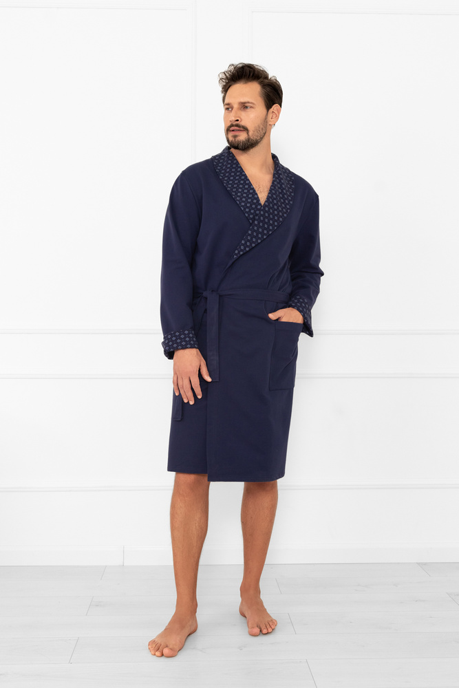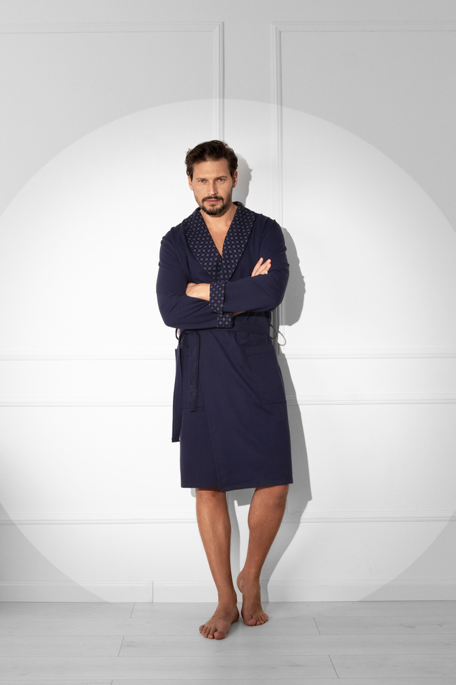 Férfi fürdőköpeny Gerard a következők kombinációja stílus és kényelem, amire minden embernek szüksége van. Made in 100% kiváló minőségű pamut, kiváló légáteresztő képességet és kényelmet biztosít a mindennapi használathoz. A modell kiemelkedik: ✔ Klasszikus vágás a férfias sziluett hangsúlyozása ✔ Kendőgallér és mandzsetta elegáns nyomtatásban ✔ Két praktikus zseb és derékszíj a tökéletes illeszkedésért