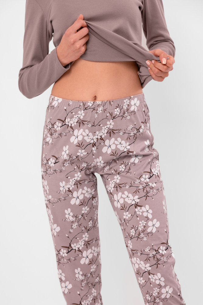 • Kimuri női pizsama pamutból, cappuccino színben. Hosszú ujjú blúz masnival a nyakrészen, virágmintás nadrág, zsebekkel és rugalmas derékszíjjal.