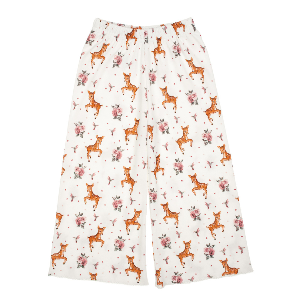 A modellt bájos mesebeli minta jellemzi: szarvasok, virágok és finom részletek jelennek meg fehér alapon, könnyedséget és bájt kölcsönözve az összképnek. A laza szabás és az elasztikus derékpánt megkönnyíti a nadrág felhúzását, és tökéletesen illeszkedik a gyermek alakjához.