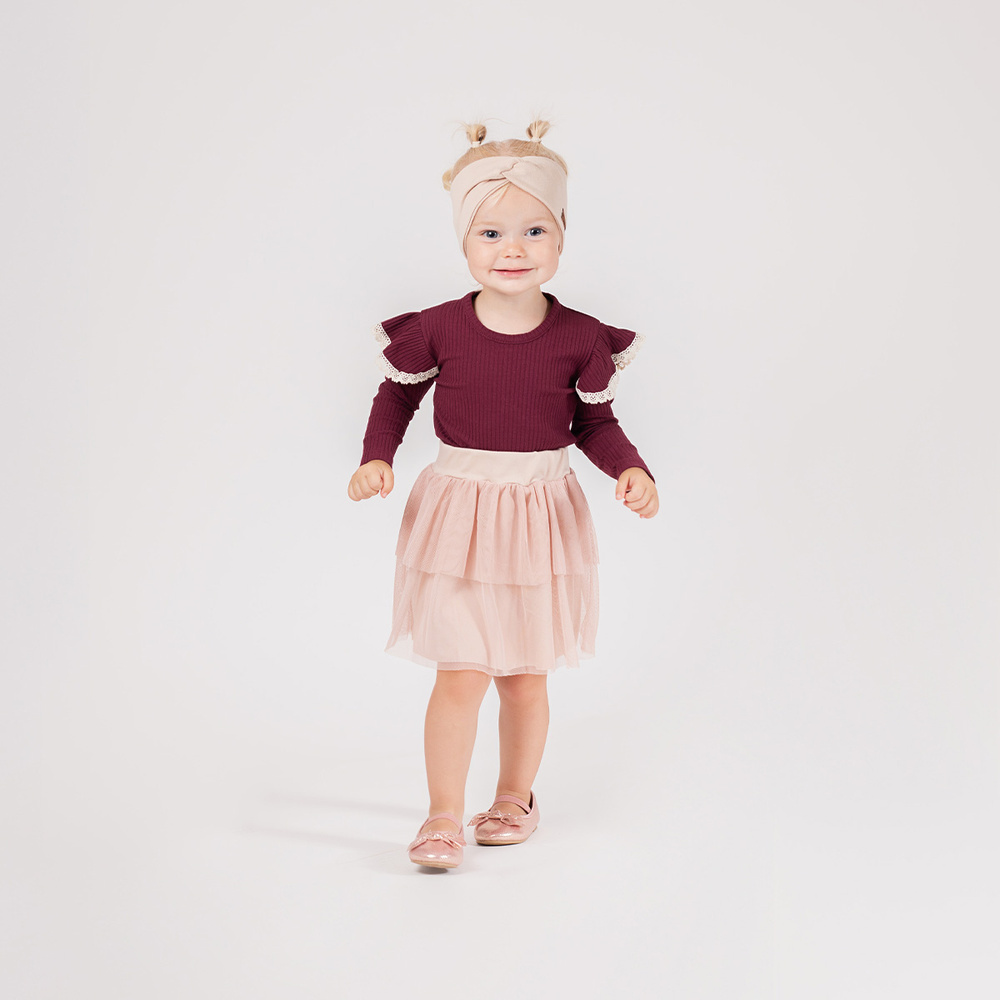 • Elegáns Nicol blúz az Alisa kollekcióból. Bordázott pamut, bordó színű, hosszú ujjú, csipkés díszítőfodrokkal.