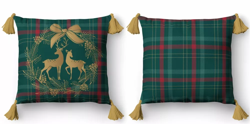 5380 A karácsonyi dekoratív díszpárnahuzat Detexpol rénszarvas koszorúban, kockás háttérrel - cipzár
