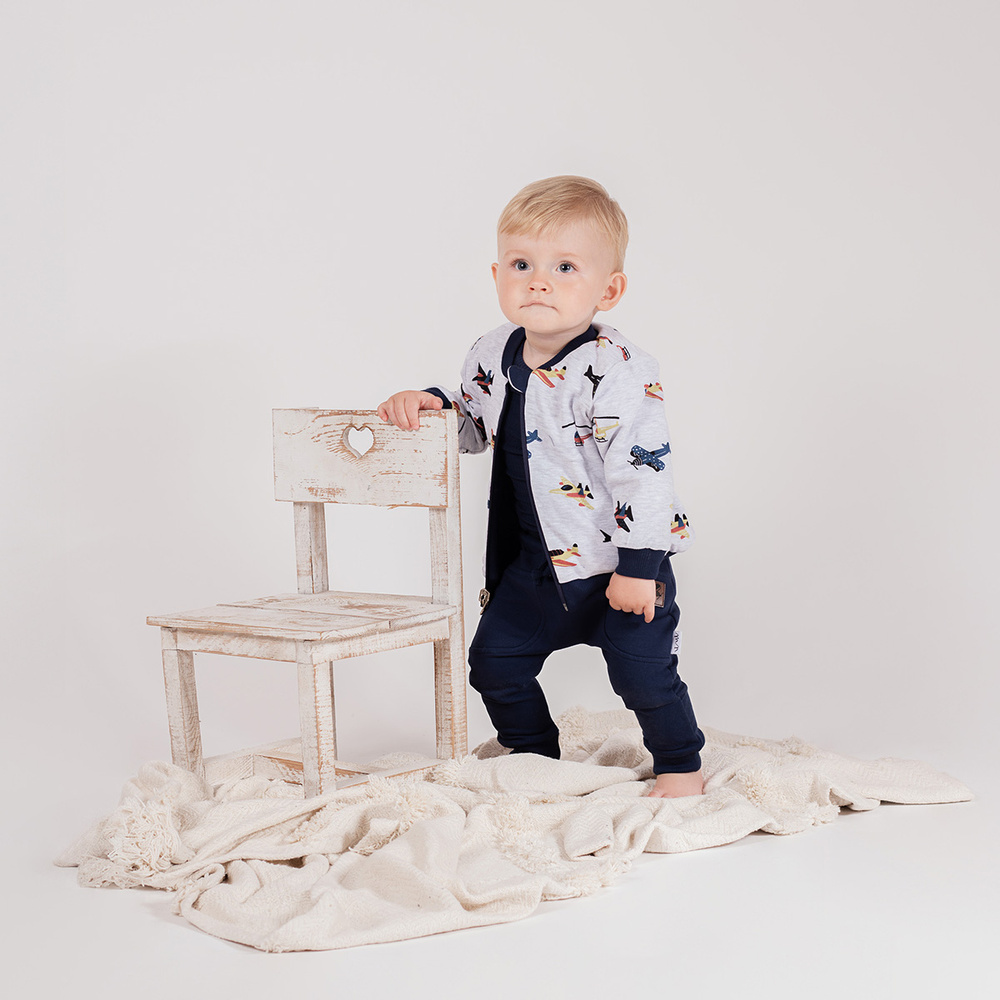 Nicol tréningkabát Willy a 219287 egy praktikus 2 az 1-ben megoldás minden kisgyermek számára. A kétoldalas modell lehetővé teszi a gyors formázást - az egyik oldal egyszerű tengerészkék, a másik oldal pedig szürke alapon repülőgépeket ábrázoló vicces nyomtatással van díszítve.
