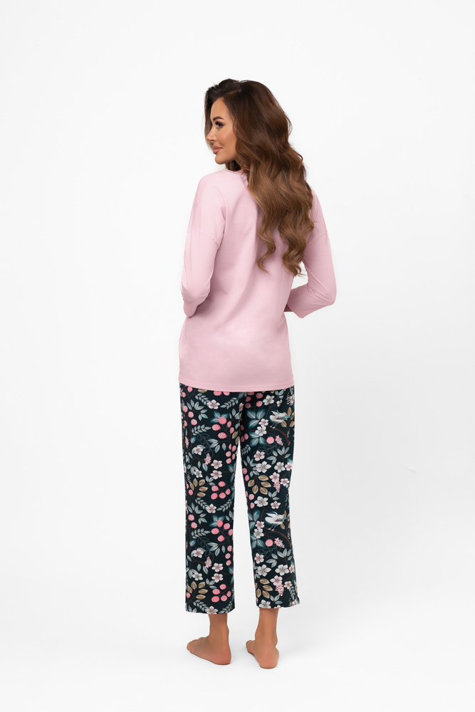 • Pamut kétrészes pizsama 3/4 ujjú blúzzal és mintás 7/8 nadrággal. Kényelmes, légáteresztő és praktikus a mindennapi használathoz.