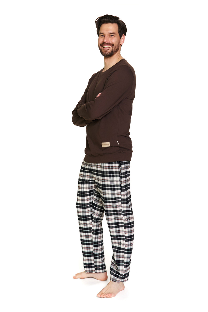 A Doctor Nap 7334 férfi pizsama tökéletes választás az őszi és téli estékre. A felső puha pamut kötött anyagból készült a kényelem és a mozgás szabadsága érdekében. A nadrágot kiváló minőségű, 100% pamut flanelből varrják, így meleg és kellemes tapintású. A klasszikus kockás minta barnás árnyalatokban időtlen hangulatot kölcsönöz a készletnek. Az egyenes szabás, a kényelmes derékpánt és a természetes anyagok teszik ezt a pizsamát tökéletessé az alváshoz és az esti otthoni pihenéshez.